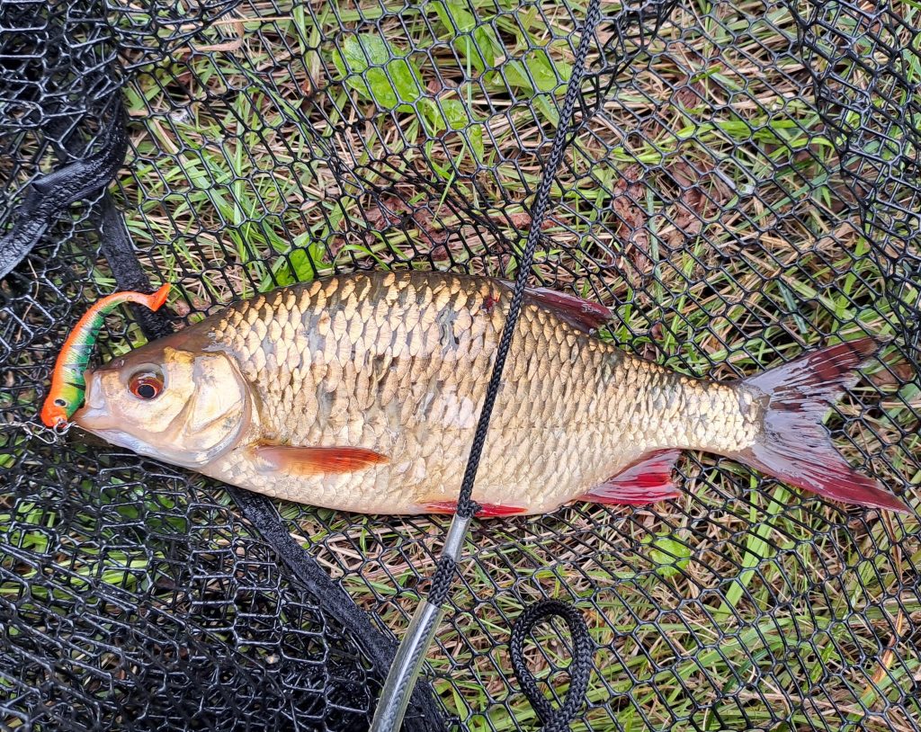 Dass sich auch mal ein Friedfisch einen Gummifisch schnappt, zeigt dieser Fang aus dem Moorgraben von Oliver W. Die Rotfeder hatte 31 cm. Petri!